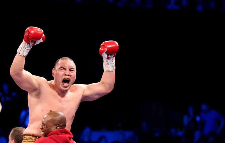 Zhang Zhilei (top) of China celebrates after defeating Joe Joyce of Britain in their WBO heavyweight interim title boxing match in London, Britain, April 15, 2023. (Xinhua/Li Ying)