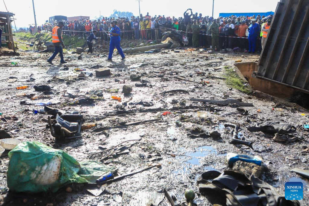 Police officers work at the site of a road accident where a driver of a truck carrying a shipping container lost control of the vehicle at Londiani Junction, Kericho County of Kenya, July 1, 2023. The death toll from a road accident in western Kenya has risen to 51, police said Saturday, as rescue efforts are underway.