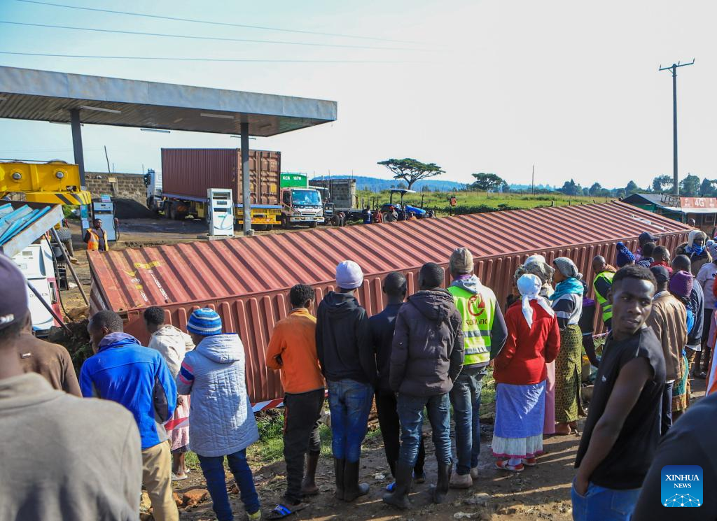This photo taken on July 1, 2023 shows people watching a container that was detached after a driver of a truck carrying the shipping container lost control of the vehicle at Londiani Junction, Kericho County of Kenya. The death toll from a road accident in western Kenya has risen to 51, police said Saturday, as rescue efforts are underway.