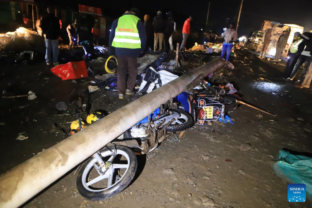 This photo taken on July 1, 2023 shows motorbikes crashed under a pole after a driver of a truck carrying a shipping container lost control of the vehicle at Londiani Junction, Kericho County of Kenya. The death toll from a road accident in western Kenya has risen to 51, police said Saturday, as rescue efforts are underway.