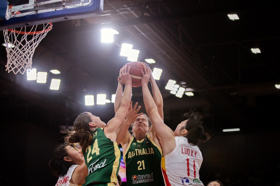 Keely Jane Froling (2nd R) and Anneli Maley (2nd L) of Australia vie for a rebound during the semifinal between China and Australia at the 2023 FIBA Women's Asia Cup in Sydney, Australia, July 1, 2023. (Photo by Hu Jingchen/Xinhua)
