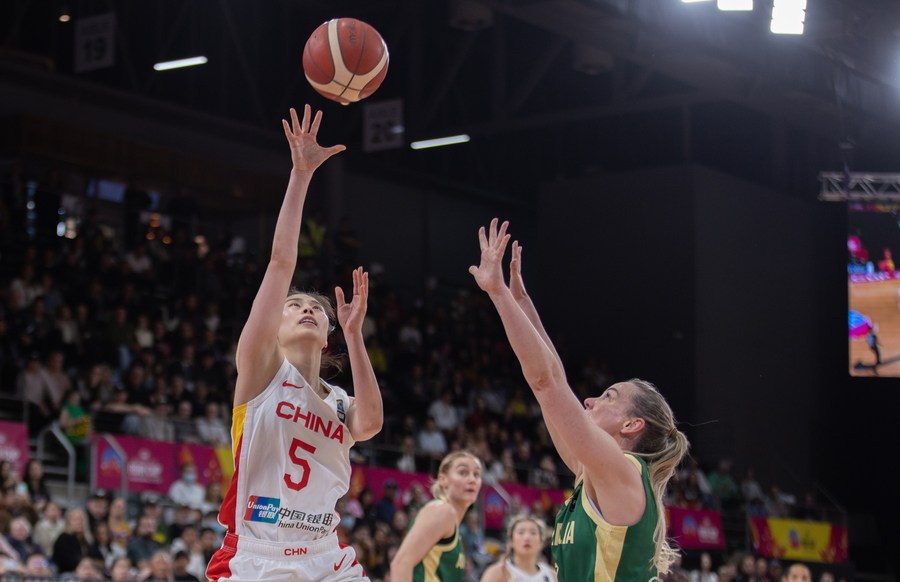 Wang Siyu (L) of China shoots during the semifinal against Australia at the 2023 FIBA Women's Asia Cup in Sydney, Australia, July 1, 2023. (Photo by Hu Jingchen/Xinhua)