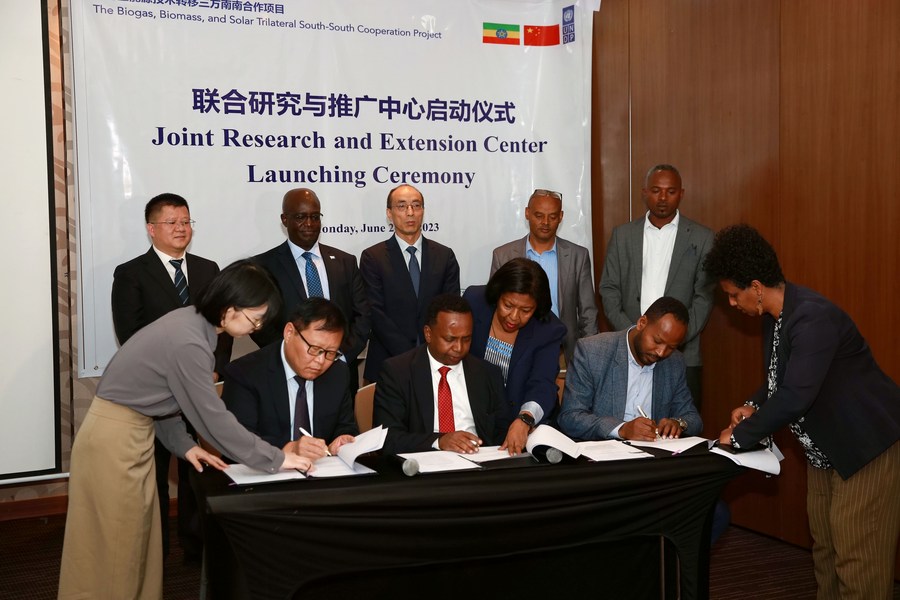 Representatives from the Ministry of Water and Energy of Ethiopia, China Agricultural University and Ethiopia's Wolaita Sodo University sign a memorandum of understanding (MoU) during a launch of the Joint Research and Extension Center in Addis Ababa, Ethiopia, on June 26, 2023. (Xinhua/Wang Ping)