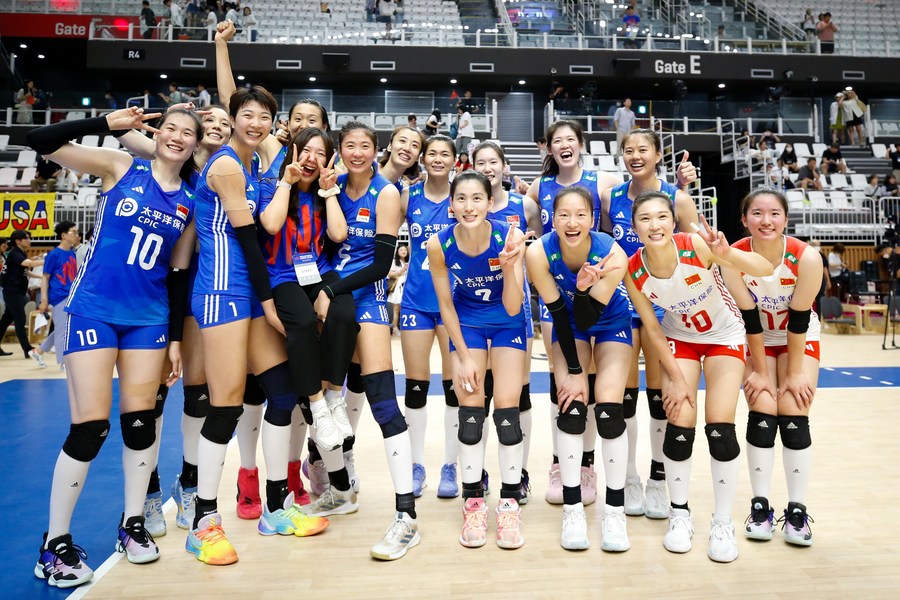 Members of team China pose for photos after winning the 2023 Volleyball Nations League match against the United States in Suwon, South Korea on July 2, 2023. (Xinhua/Wang Yiliang)