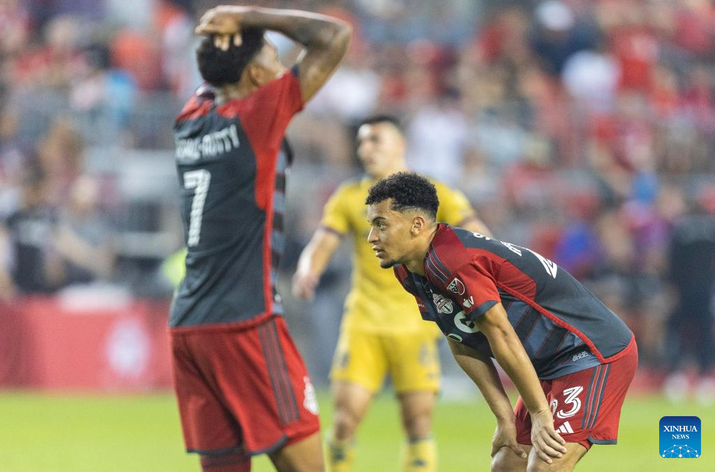 Brandon Servania (R) of Toronto FC reacts after missing a shot during the 2023 Major League Soccer (MLS) match between Toronto FC and Real Salt Lake in Toronto, Canada, on July 1, 2023. (Photo by Zou Zheng/Xinhua)