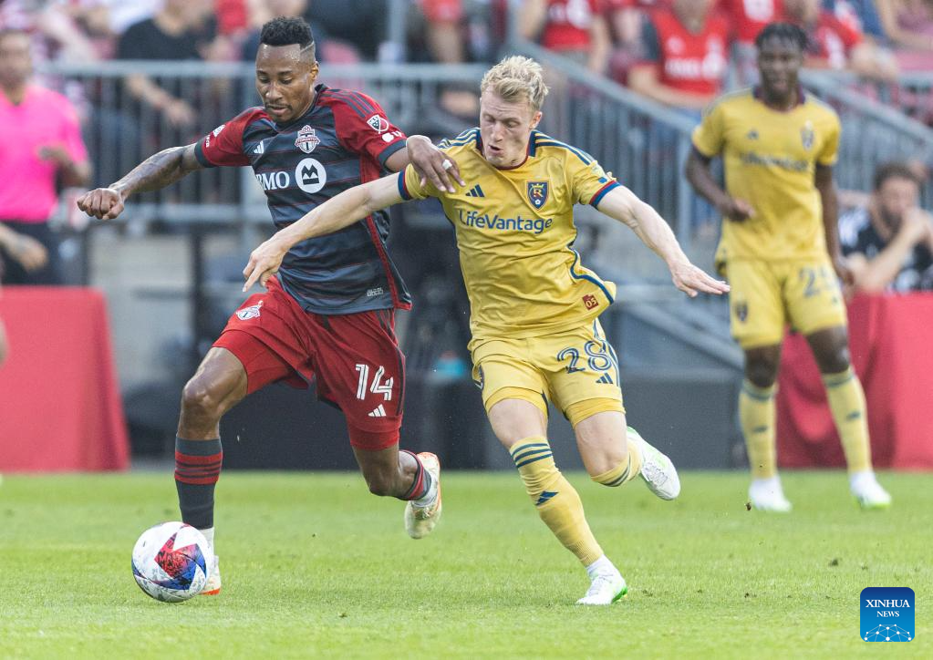 Mark-Anthony Kaye (L) of Toronto FC vies with Jasper Loffelsend of Real Salt during the 2023 Major League Soccer (MLS) match between Toronto FC and Real Salt Lake in Toronto, Canada, on July 1, 2023. (Photo by Zou Zheng/Xinhua)