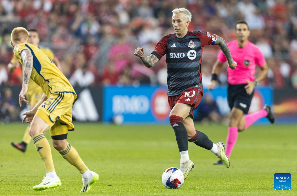 Federico Bernardeschin (R) of Toronto FC breaks through during the 2023 Major League Soccer (MLS) match between Toronto FC and Real Salt Lake in Toronto, Canada, on July 1, 2023. (Photo by Zou Zheng/Xinhua)
