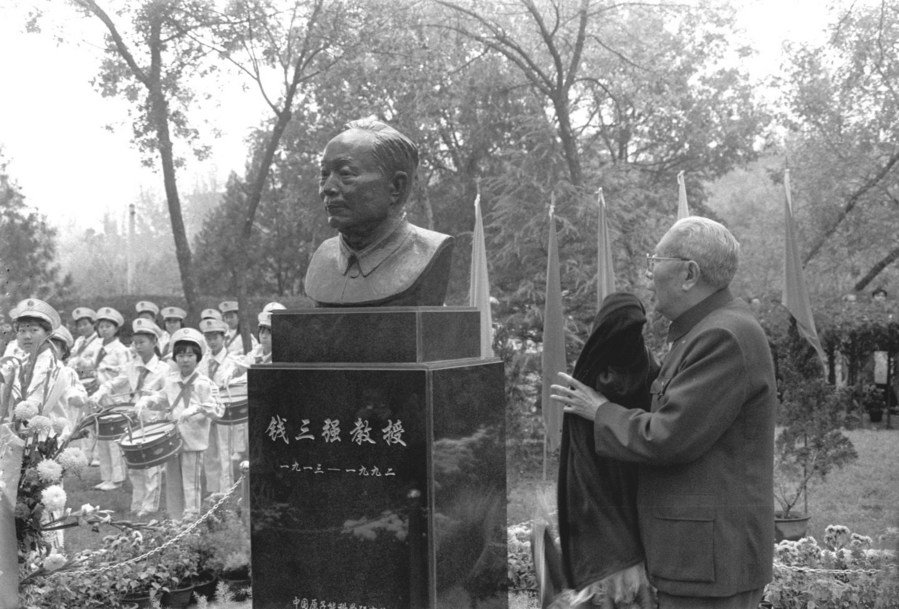 The bronze statue of Qian Sanqiang, an internationally famous expert in nuclear physics, is unveiled in Beijing on Oct. 11, 1993. (Xinhua/Bai Liansuo)