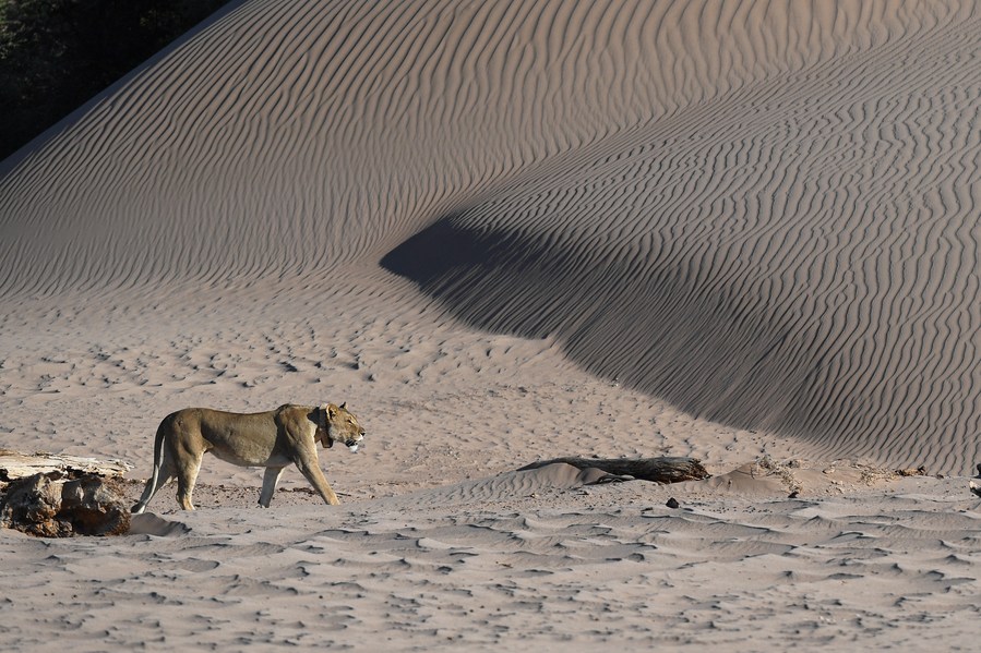 A lion is pictured at the Hoanib River drainage in northern Namibia, Feb. 8, 2023. (Xinhua/Chen Cheng)