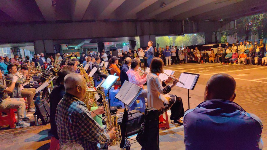 This photo taken with a mobile phone shows an amateur orchestra performing beneath an overpass in Harbin, northeast China's Heilongjiang Province, June 20, 2023. (Xinhua/Wang Junbao)