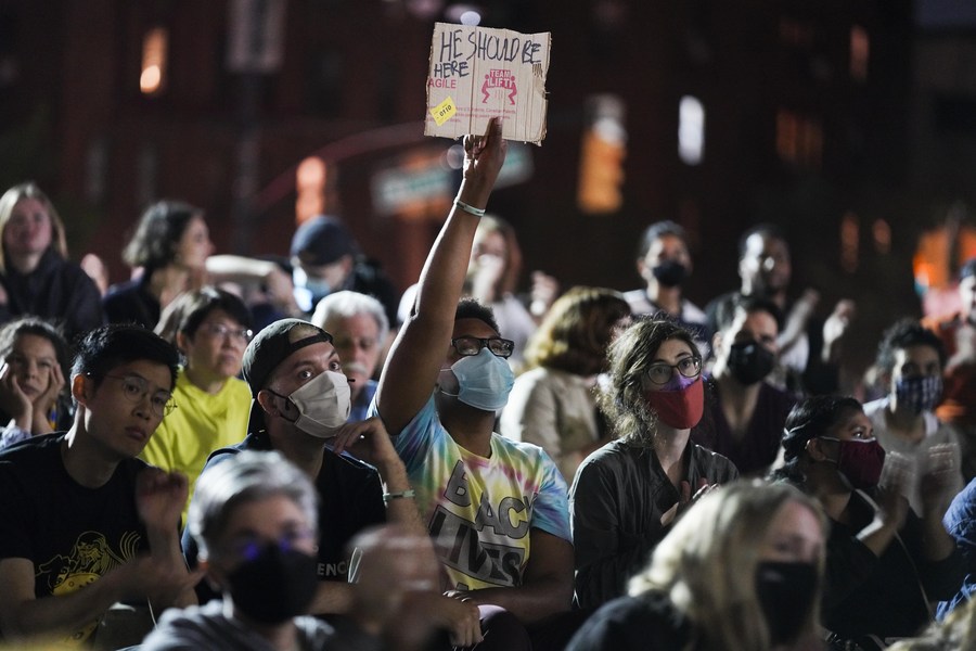 People attend a rally to mark the one-year anniversary of George Floyd's death in New York, the United States, May 25, 2021. (Xinhua/Wang Ying)