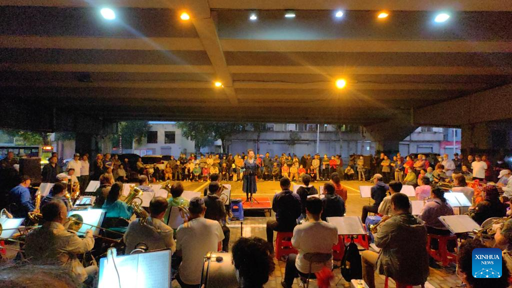 This photo taken with a mobile phone shows an amateur orchestra performing beneath an overpass in Harbin, northeast China's Heilongjiang Province, June 20, 2023. (Xinhua/Wang Junbao)