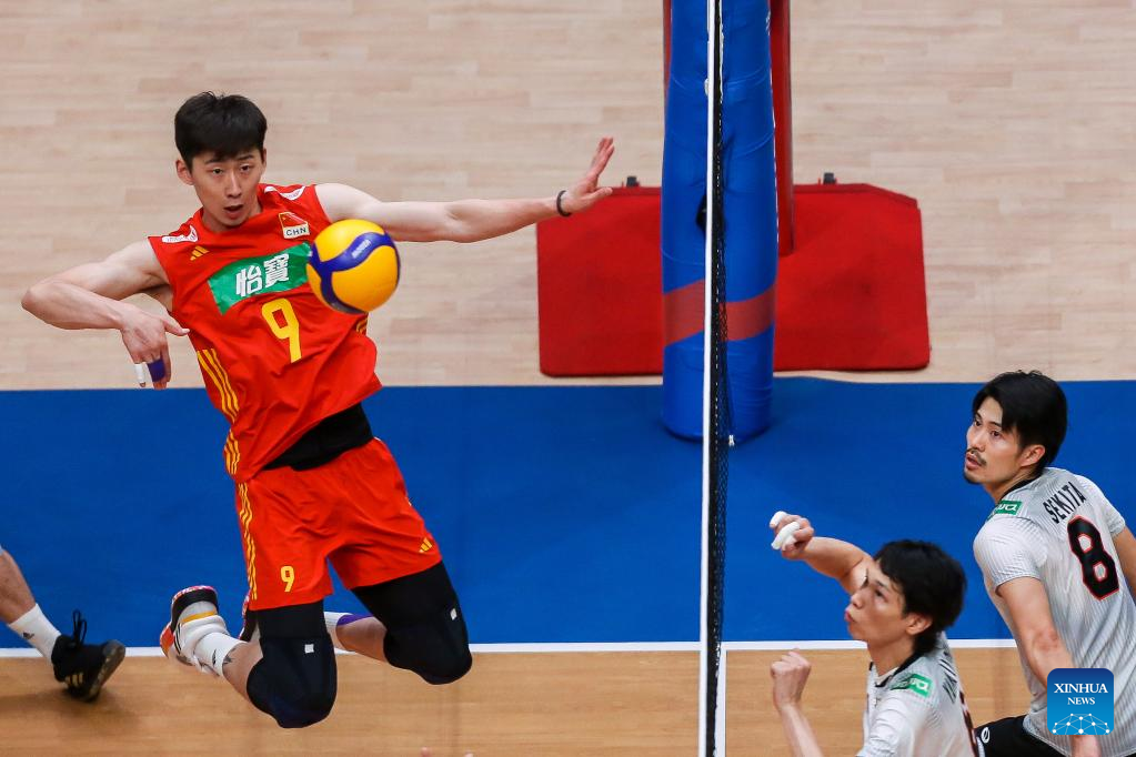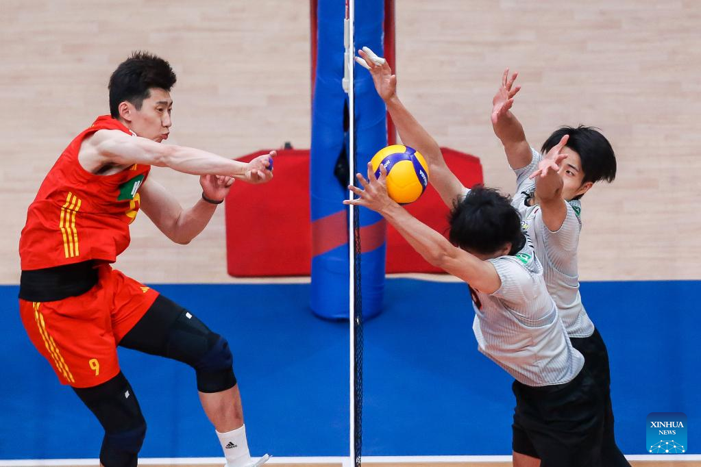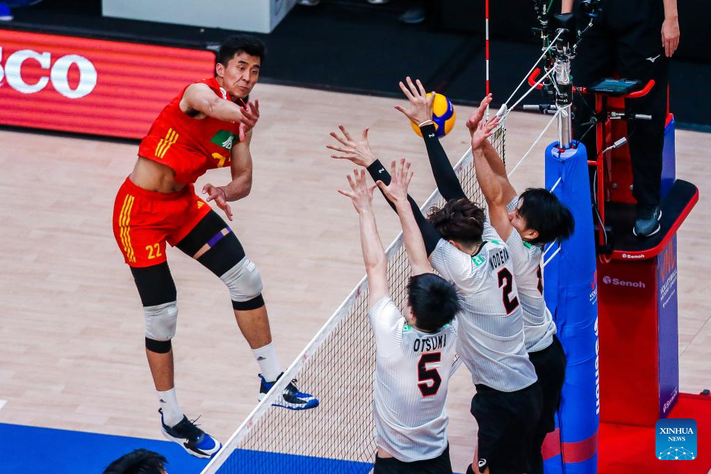 Zhang Jingyin (1st L) of China spikes the ball during the Pool 6 match between Japan and China at the Men's Volleyball Nations League in Pasay City, the Philippines, July 4, 2023. (Xinhua/Rouelle Umali)