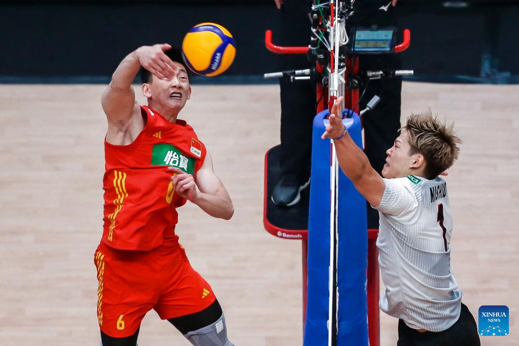 Li Yongzhen (L) of China spikes the ball during the Pool 6 match between Japan and China at the Men's Volleyball Nations League in Pasay City, the Philippines, July 4, 2023. (Xinhua/Rouelle Umali)