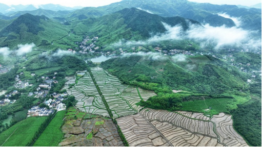 Aerial photo taken on June 25, 2023 shows scenery of Laoling Village after rain in Moganshan Town, Deqing County, east China's Zhejiang Province. Under the Green Rural Revival Program launched in Zhejiang, the living environment in Moganshan Town and life quality of locals have been significantly improved. (Xinhua/Xie Shangguo)
