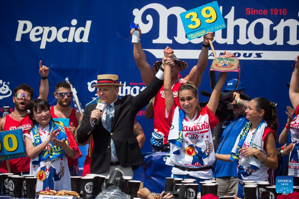 Miki Sudo competes during a hot dog eating contest at Coney Island, New York City, the United States, on July 4, 2023. Named the Nathan's Famous Fourth of July International Hot Dog Eating Contest, the annual event has occurred each July 4 on Coney Island since 1916, according to archives. Joey Chestnut, 39, won the first place for the 16th time by eating 62 hot dogs and buns in 10 minutes. Miki Sudo, 37, won the women's championship for the ninth time on Tuesday morning by consuming 39.5 hot dogs and buns in 10 minutes. (Photo by Michael Nagle/Xinhua)