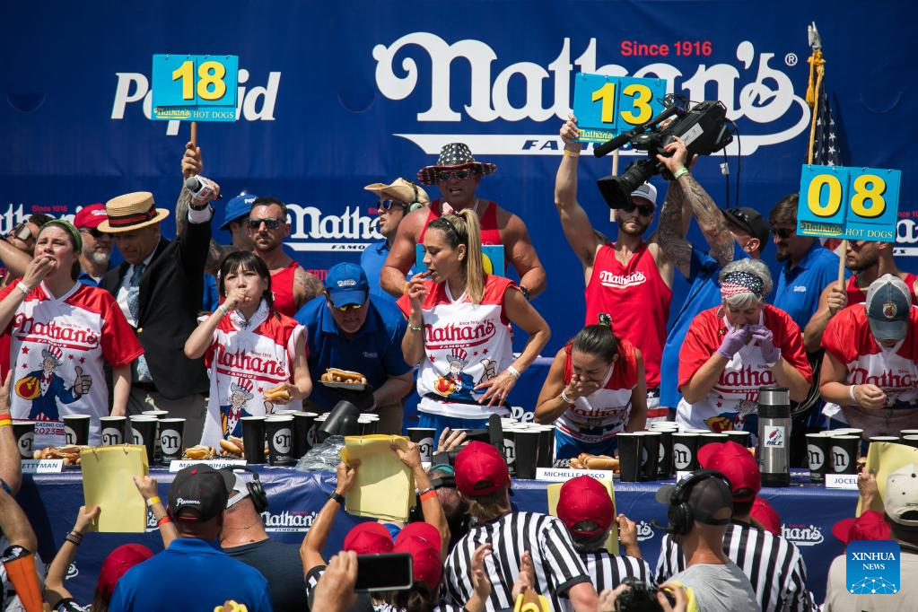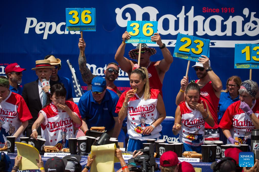 Miki Sudo (2nd R, Front) wins the women's championship of a hot dog eating contest at Coney Island, New York City, the United States, on July 4, 2023. Named the Nathan's Famous Fourth of July International Hot Dog Eating Contest, the annual event has occurred each July 4 on Coney Island since 1916, according to archives. Joey Chestnut, 39, won the first place for the 16th time by eating 62 hot dogs and buns in 10 minutes. Miki Sudo, 37, won the women's championship for the ninth time on Tuesday morning by consuming 39.5 hot dogs and buns in 10 minutes. (Photo by Michael Nagle/Xinhua)