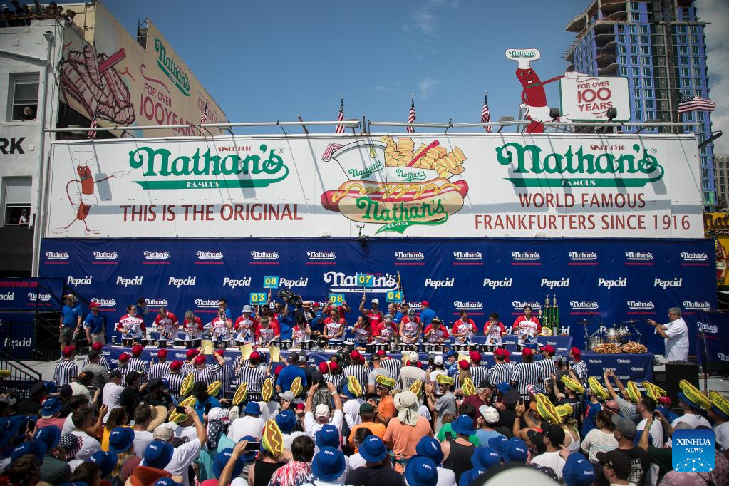 Contestants compete during a hot dog eating contest at Coney Island, New York City, the United States, on July 4, 2023. Named the Nathan's Famous Fourth of July International Hot Dog Eating Contest, the annual event has occurred each July 4 on Coney Island since 1916, according to archives. Joey Chestnut, 39, won the first place for the 16th time by eating 62 hot dogs and buns in 10 minutes. Miki Sudo, 37, won the women's championship for the ninth time on Tuesday morning by consuming 39.5 hot dogs and buns in 10 minutes. (Photo by Michael Nagle/Xinhua)
