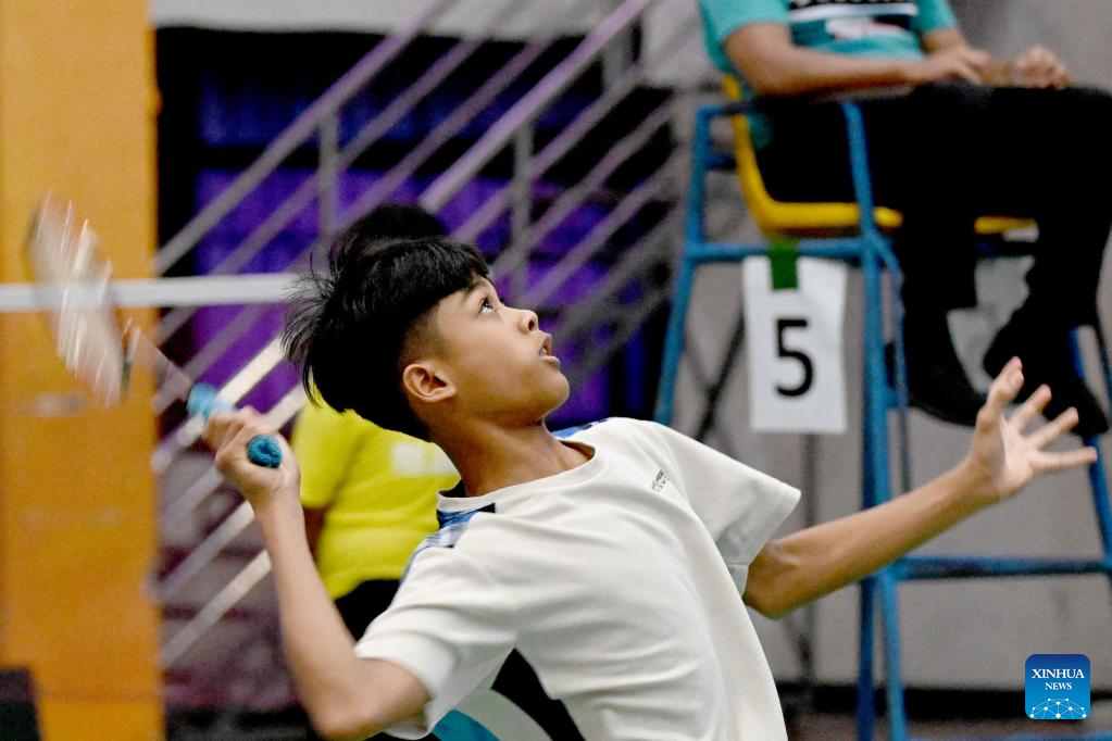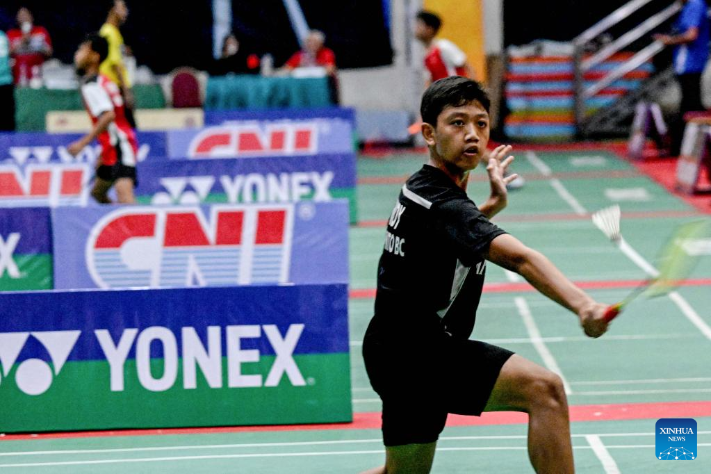 A boy participates in a boys' singles match as a part of World Badminton Day events held by the Badminton Association of Indonesia (PBSI) Jakarta Selatan branch in Jakarta, Indonesia, July 5, 2023. The Badminton World Federation (BWF) announced that starting from 2022, July 5 would be the World Badminton Day every year. (Xinhua/Agung Kuncahya B.)