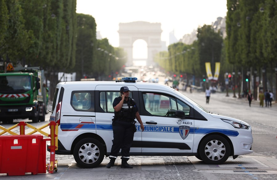 A French municipal police officer is seen on duty on the famous Champs-Elysees Avenue in Paris, France, July 2, 2023. (Xinhua/Gao Jing)