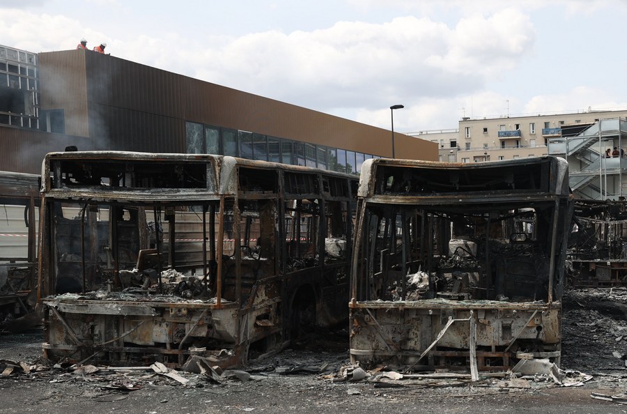 Burnt buses are seen at the Fort d'Aubervilliers bus terminal, in Aubervilliers, north of Paris, France, June 30, 2023. (Xinhua/Gao Jing)