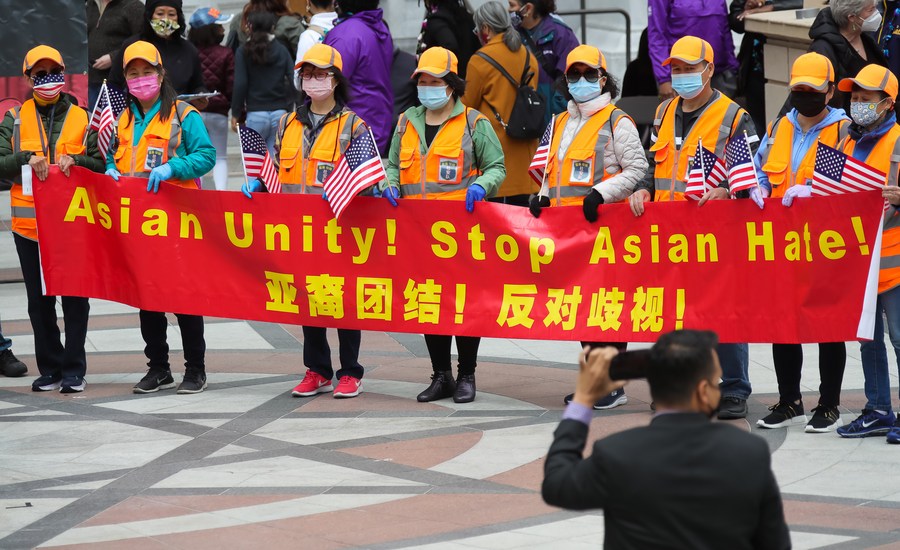 People rally to protest against anti-Asian hate crimes on Foley Square in New York, the United States, April 4, 2021. (Xinhua/Wang Ying)