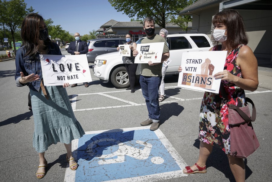 People hold signs during a rally against anti-Asian hate crimes in Richmond, British Columbia, Canada, on May 14, 2021. (Photo by Liang Sen/Xinhua)