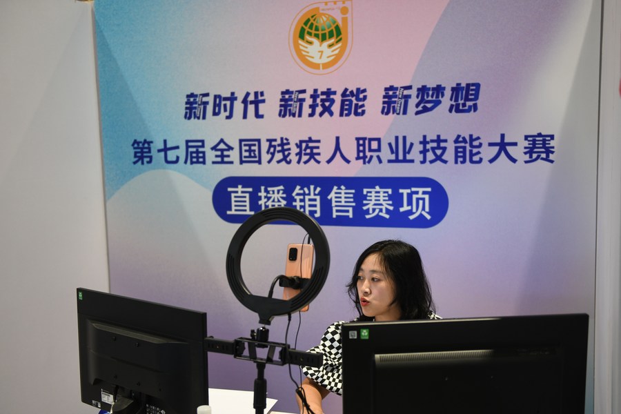 A woman takes part in a contest to sell products via livestream during the seventh National Vocational Skills Competition for Disabled People in Jinan, east China's Shandong Province, June 27, 2023. (Xinhua/Zhu Zheng)