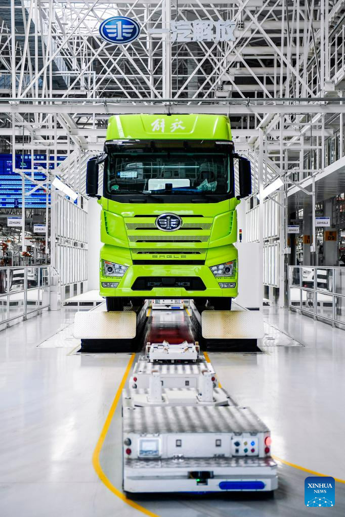 Workers assemble a truck on automatic guided vehicles at an intelligent plant of truck manufacturer First Automotive Works Jiefang Co., Ltd. (FAW Jiefang) in Changchun, northeast China's Jilin Province, June 12, 2023. (Xinhua/Yan Linyun)