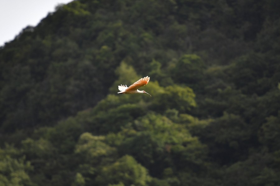 A crested ibis flies over the Zhaigou Village of Ningshan County, northwest China's Shaanxi Province, Oct. 10, 2022. (Xinhua/Shao Rui)
