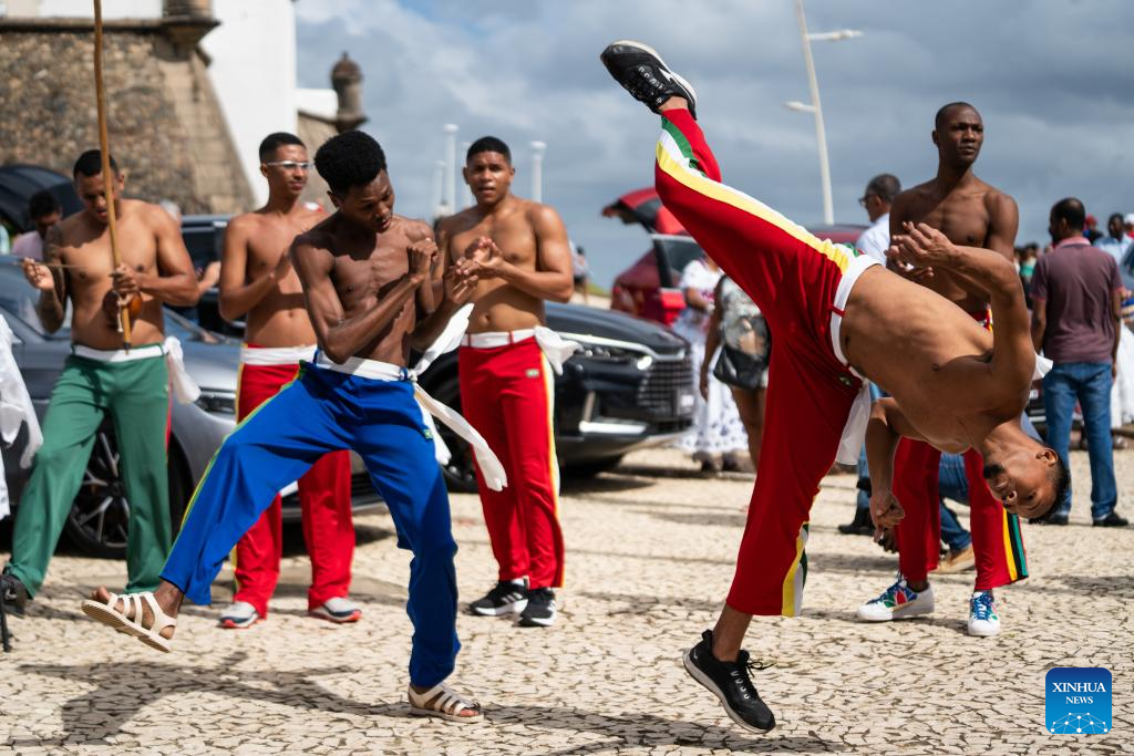Local artists perform the Capoeira in Salvador, Bahia state, Brazil, July 4, 2023. (Xinhua/Wang Tiancong)