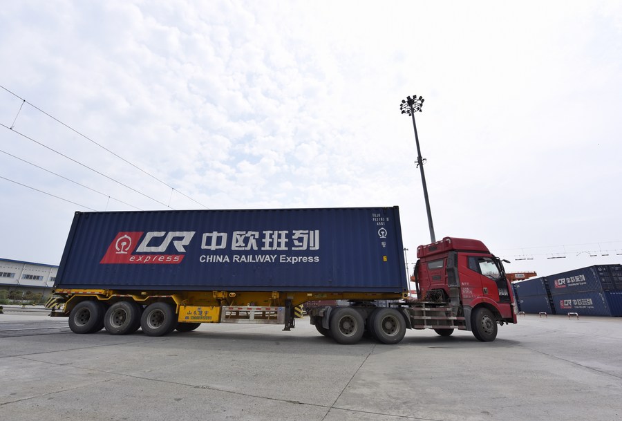 A truck transports goods at Chengdu International Railway Port in Chengdu, capital of southwest China's Sichuan Province, Aug. 5, 2020. (Xinhua/Liu Kun)