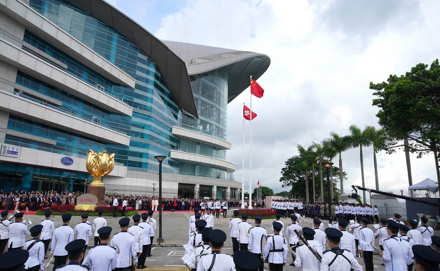 A flag-raising ceremony is held by the government of the Hong Kong Special Administrative Region to celebrate the 26th anniversary of Hong Kong's return to the motherland, at the Golden Bauhinia Square in Hong Kong, south China, July 1, 2023. (Xinhua/Lui Siu Wai)