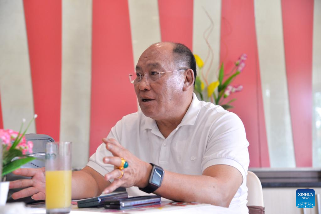 Welly Soegiono, director of corporate affairs of PT. Great Giant Pineapple, a large private-label manufacturer of canned pineapples, talks to Xinhua correspondents at PT. Great Giant Pineapple in Terbanggi Besar of Lampung Province, Indonesia, July 5, 2023. (Xinhua/Xu Qin)