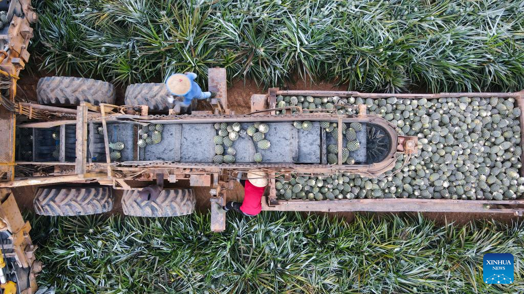 JAKARTA, July 8 (Xinhua) -- At central Lampung province in the southern part of Indonesia's Sumatra island, gloved workers are picking ripe pineapples in the field and throwing them onto a conveyer belt, with a truck waiting at the other end to take the fruit to the canning factory.
