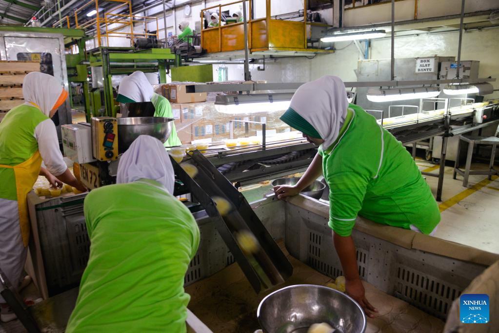 Workers pack pineapple products at the factory department of PT. Great Giant Pineapple, a large private-label manufacturer of canned pineapples, in Terbanggi Besar of Lampung Province, Indonesia, July 5, 2023. (Xinhua/Xu Qin)