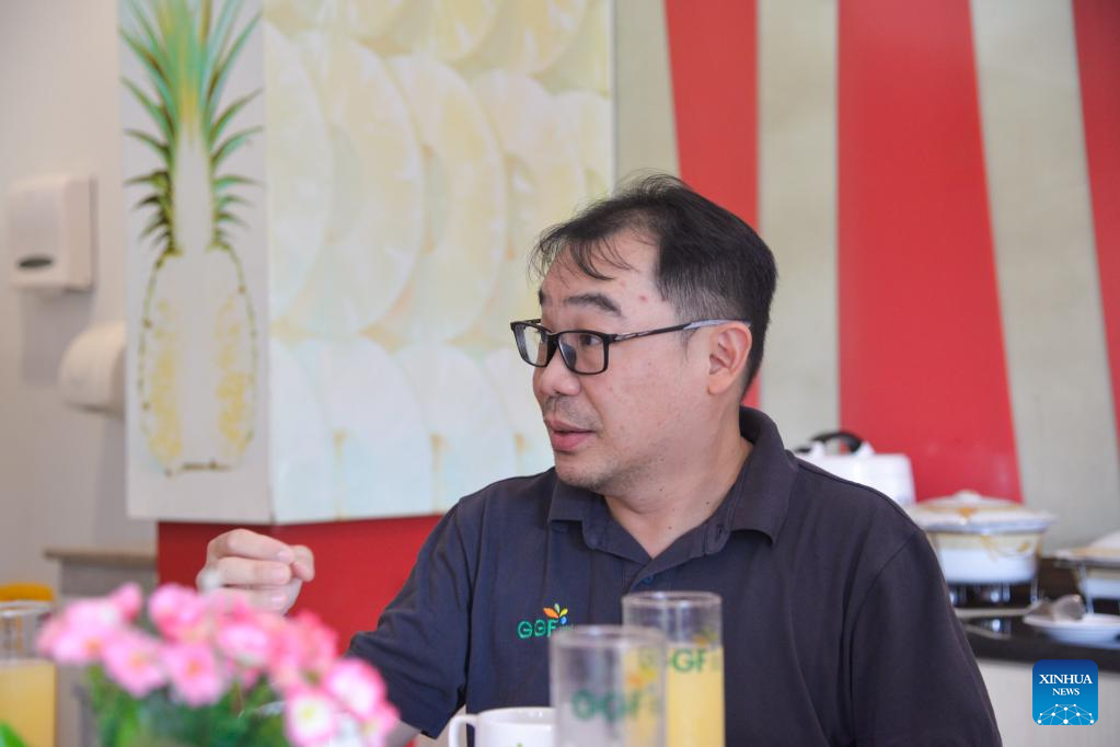Cindyanto Kristian, CEO of fresh fruit and GTM (Go to Market) of PT. Sewu Segar Nusantara, talks to Xinhua correspondents at PT. Great Giant Pineapple in Terbanggi Besar of Lampung Province, Indonesia, July 5, 2023. (Xinhua/Xu Qin)
