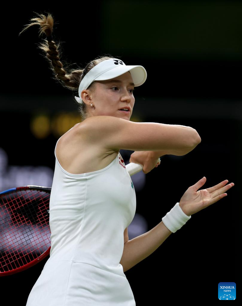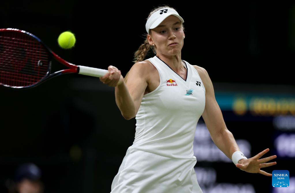 Elena Rybakina competes during the women's singles third round match between Elena Rybakina of Kazakhstan and Katie Boulter of Britain at Wimbledon tennis Championship in London, Britain, on July 8, 2023. (Xinhua/Han Yan)