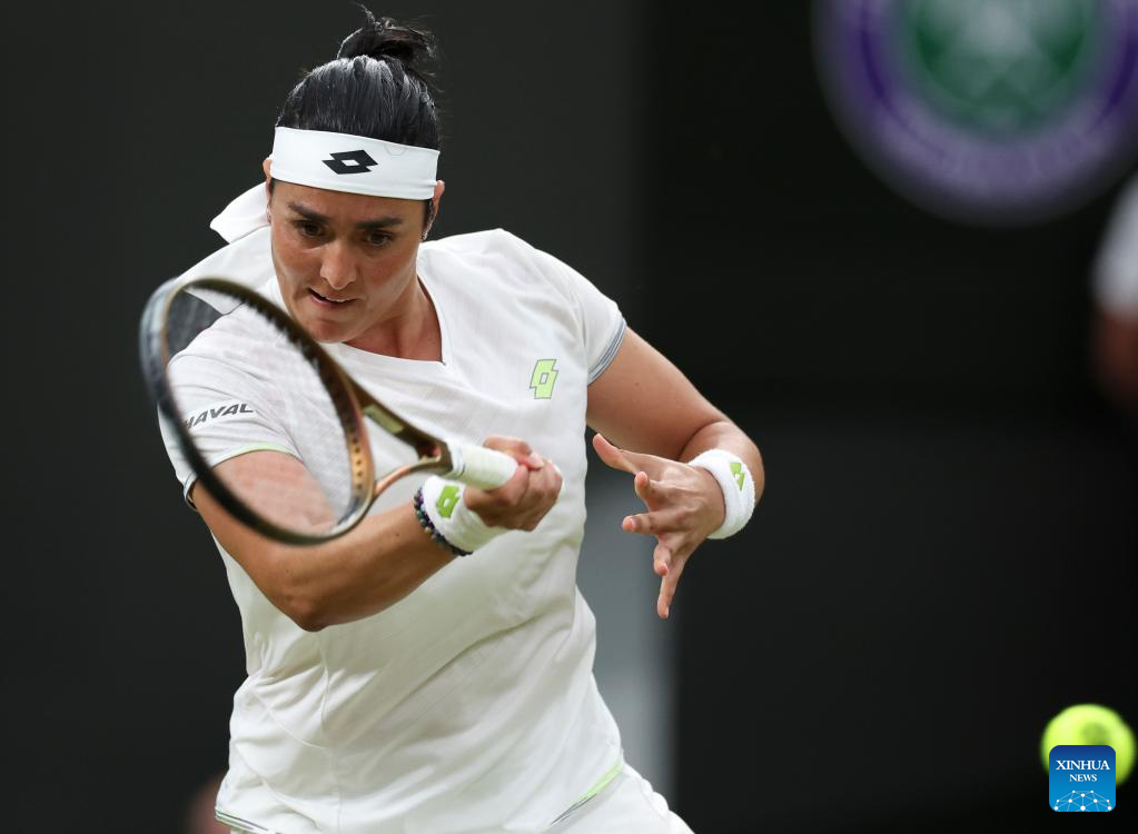 Ons Jabeur returns a shot during the women's singles third round match between Ons Jabeur of Tunisia and Bianca Andreescu of Canada at Wimbledon tennis Championship in London, Britain, on July 8, 2023. (Xinhua/Han Yan)