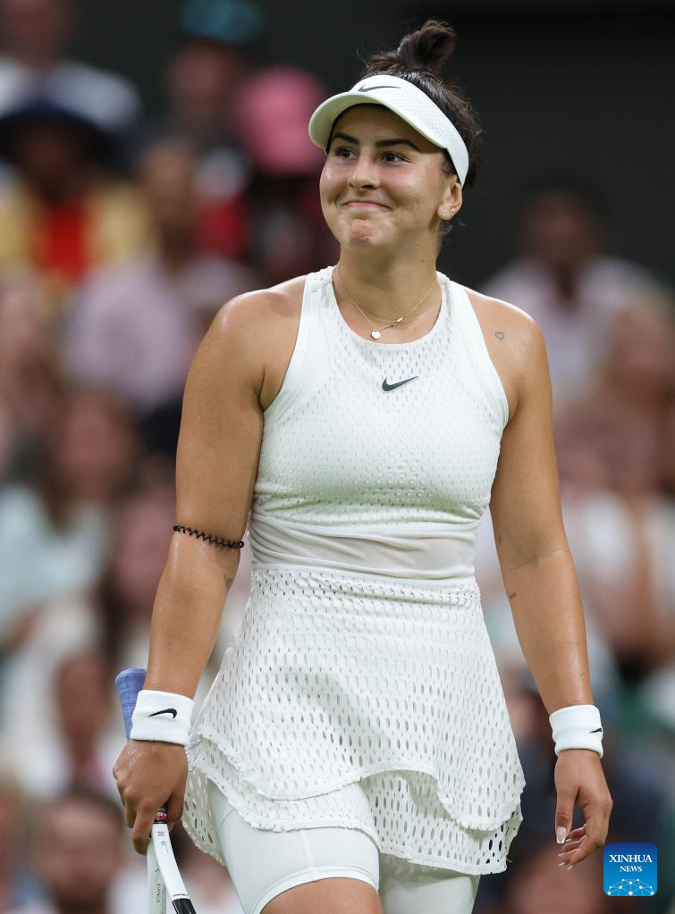 Bianca Andreescu reacts during the women's singles third round match between Ons Jabeur of Tunisia and Bianca Andreescu of Canada at Wimbledon tennis Championship in London, Britain, on July 8, 2023. (Xinhua/Han Yan)