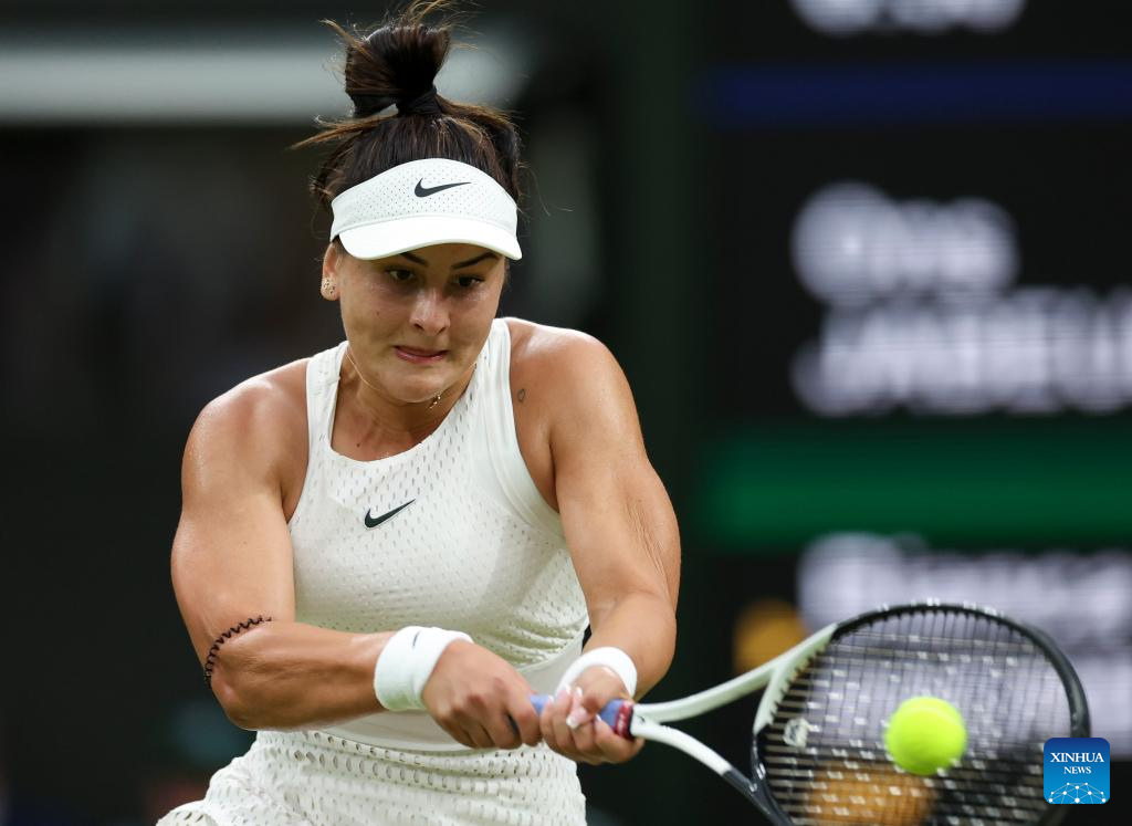 Bianca Andreescu of Canada returns a shot during the women's singles third round match between Ons Jabeur of Tunisia and Bianca Andreescu of Canada at Wimbledon tennis Championship in London, Britain, on July 8, 2023. (Xinhua/Han Yan)
