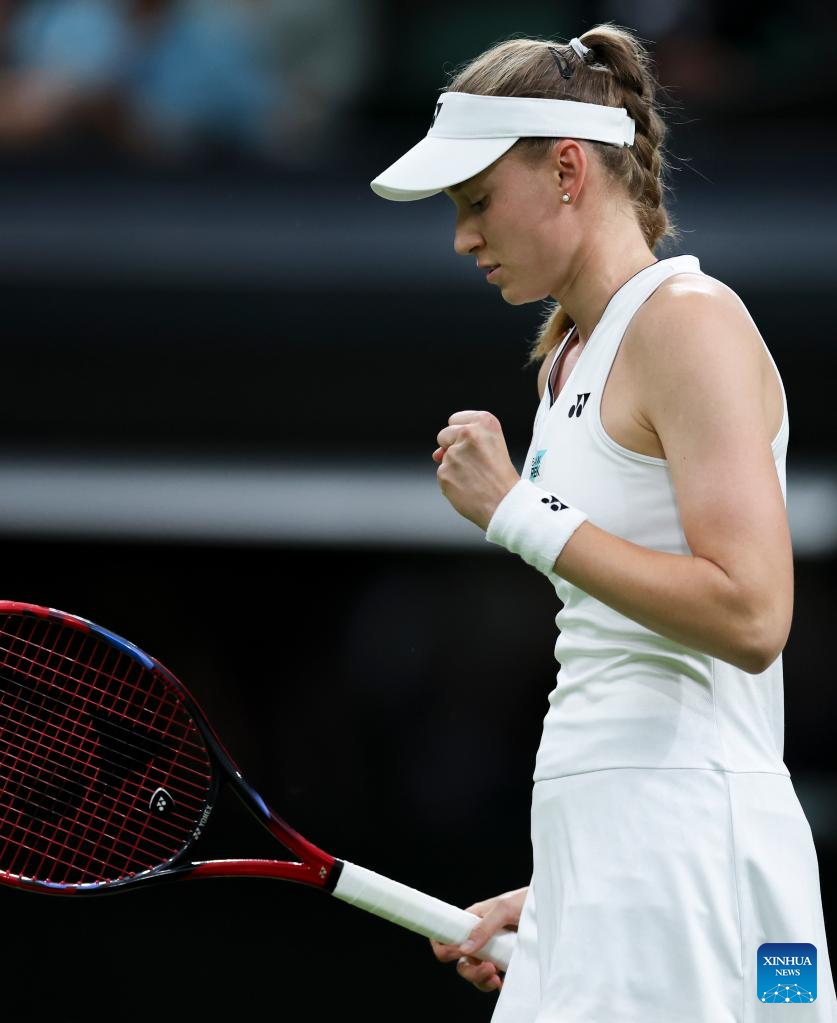 Elena Rybakina celebrates during the women's singles third round match between Elena Rybakina of Kazakhstan and Katie Boulter of Britain at Wimbledon tennis Championship in London, Britain, on July 8, 2023. (Xinhua/Han Yan)