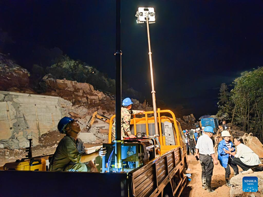 The landslide of more than 500,000 cubic meters struck the construction site in Yueshan Village, Tujia Autonomous County of Wufeng, at around 4 p.m. Saturday. As of 8 a.m. Sunday, a total of five people had been rescued, according to the county's latest statement.