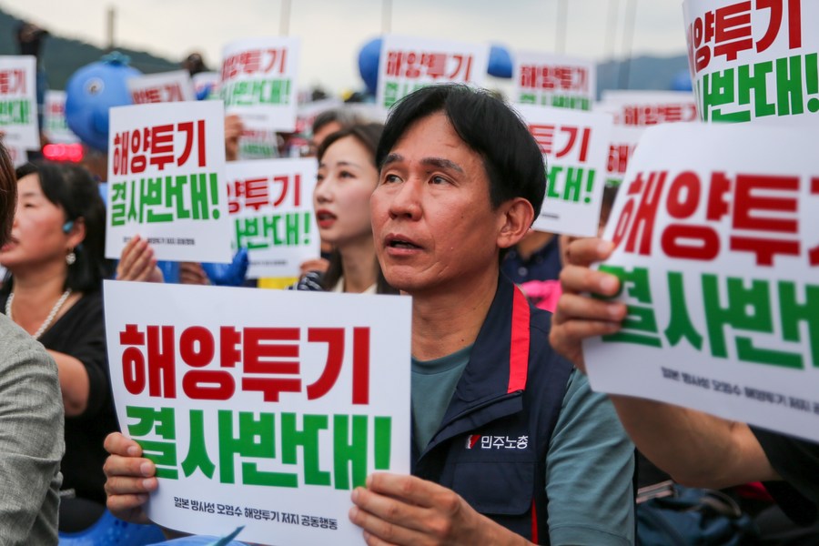 SEOUL, July 9(Xinhua) -- A group of South Korean civic activists, politicians, fishermen and ordinary people gathered in central Seoul on Saturday to raise their voice against the International Atomic Energy Agency's (IAEA) final report on Japan's planned discharge of nuclear wastewater into the Pacific.