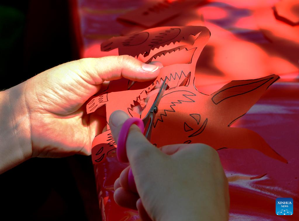 A visitor learns paper-cutting during the cultural festival "Culture meets Garden" at the Gardens of the World in Berlin, Germany, on July 8, 2023. The festival was held here from Saturday to Sunday. (Xinhua/Ren Pengfei)