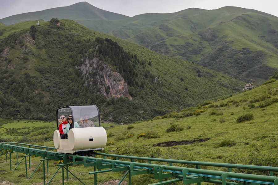 Tourists take a sightseeing railcar at Zecha stone forest scenic spot in Luqu County of the Tibetan Autonomous Prefecture of Gannan, northwest China's Gansu Province, July 8, 2023. (Xinhua/Zhang Keren)