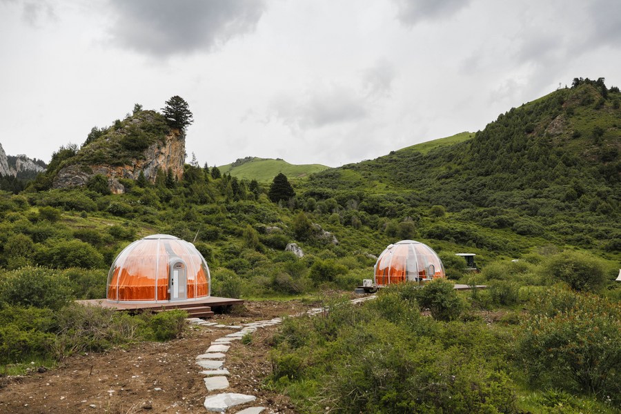 This photo taken on July 8, 2023 shows the tents at the Zecha stone forest scenic spot in Luqu County of the Tibetan Autonomous Prefecture of Gannan, northwest China's Gansu Province. (Xinhua/Chen Bin)