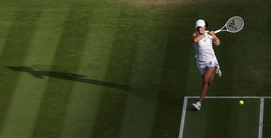 Iga Swiatek in action during her Wimbledon women's singles fourth round win against Belinda Bencic in London, United Kingdom, July 9, 2023. (Xinhua/Han Yan)