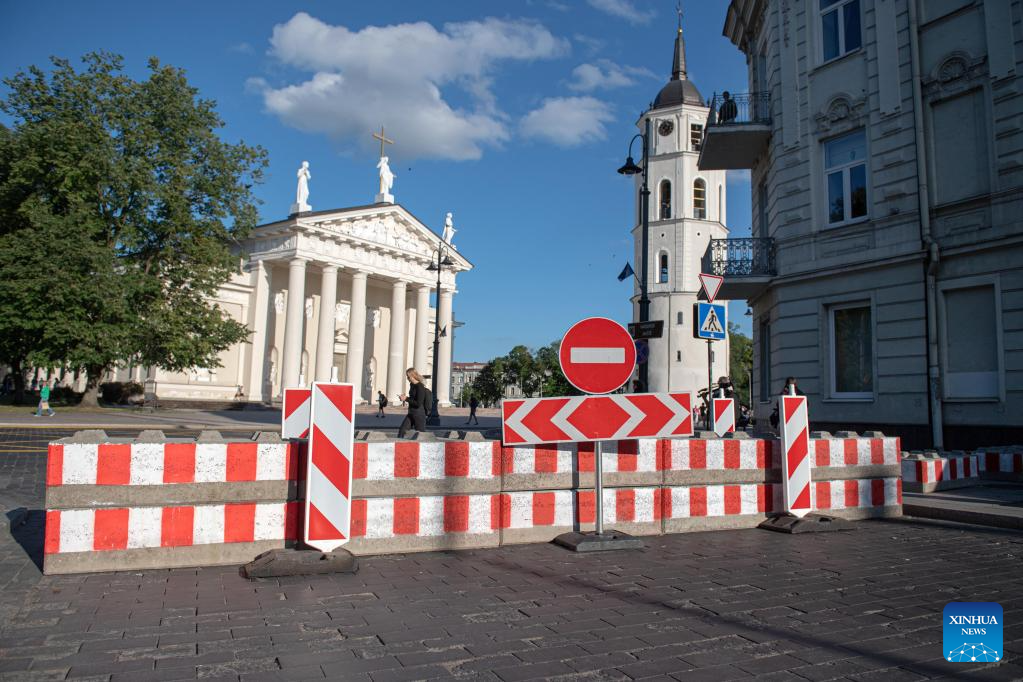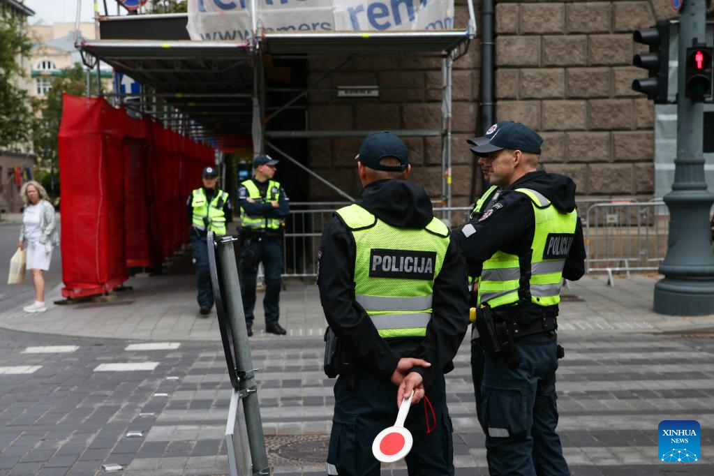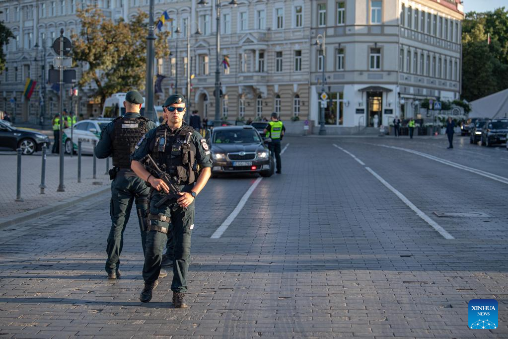 Police personnel are on duty on a street in Vilnius, Lithuania, July 10, 2023. The NATO summit is slated for July 11-12 in Vilnius. (Xinhua/Zheng Huansong)