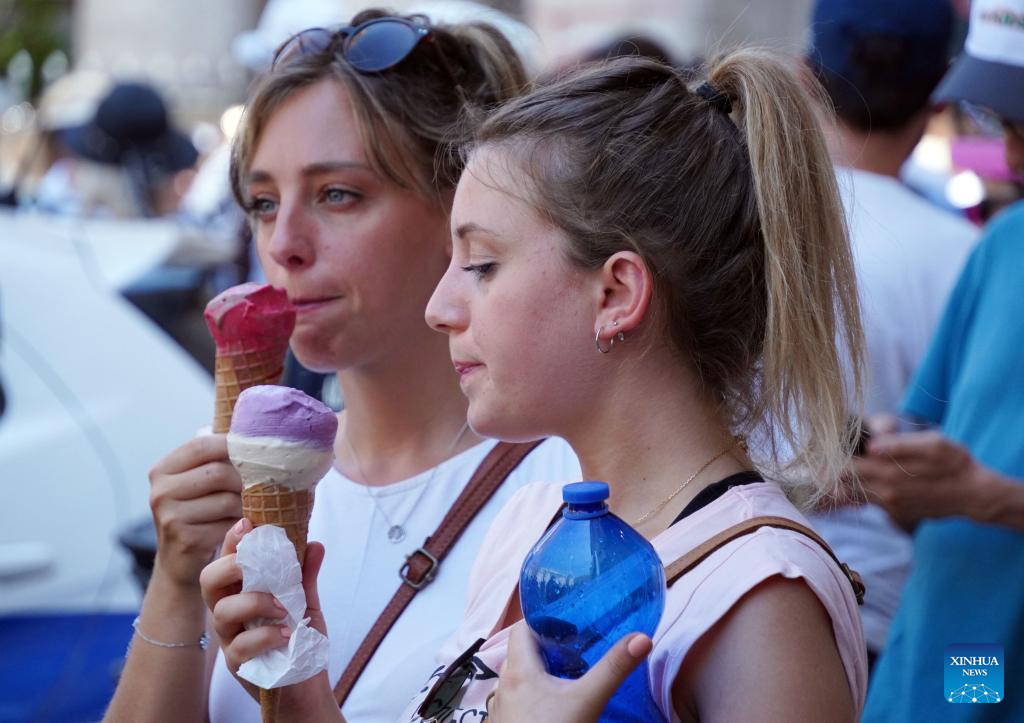 People eat ice creams amid a heatwave in Rome, Italy, on July 10, 2023. Rome and other cities across Italy were put on red alert on Monday as the country was bracing for an intense heatwave that meteorologists said was likely to break records. (Xinhua/Jin Mamengni)